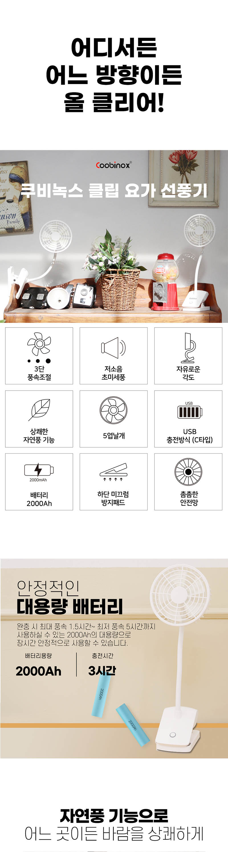 클립 고정이 가능한 곳이면 어디든 시원하게 사용가능하죠!