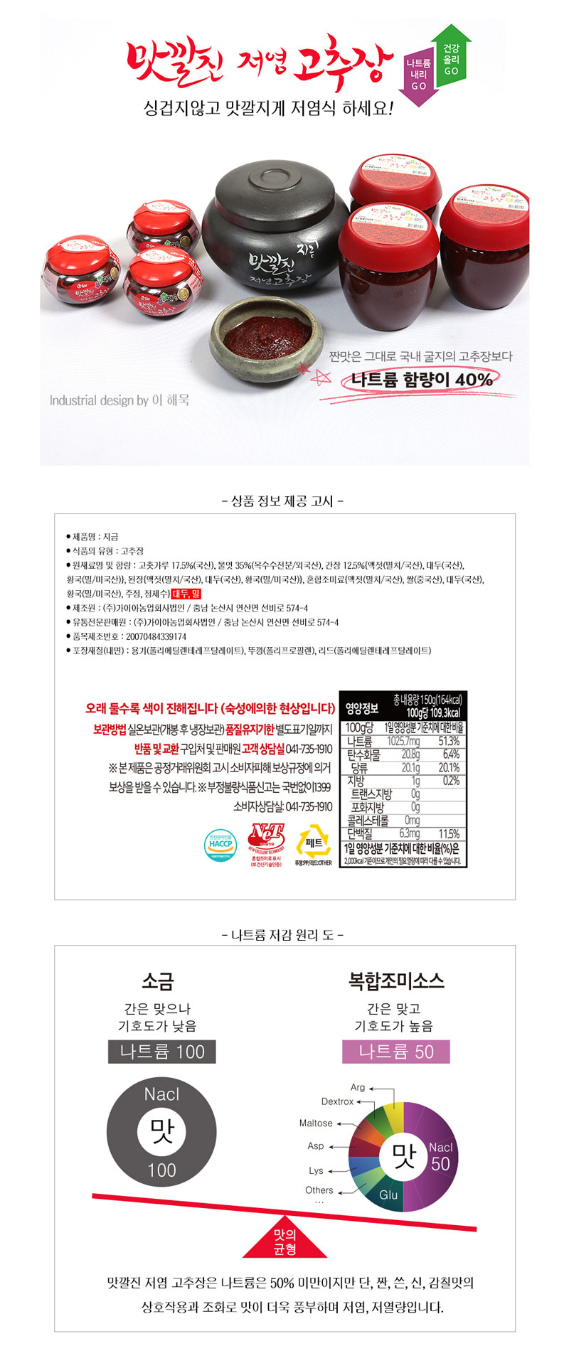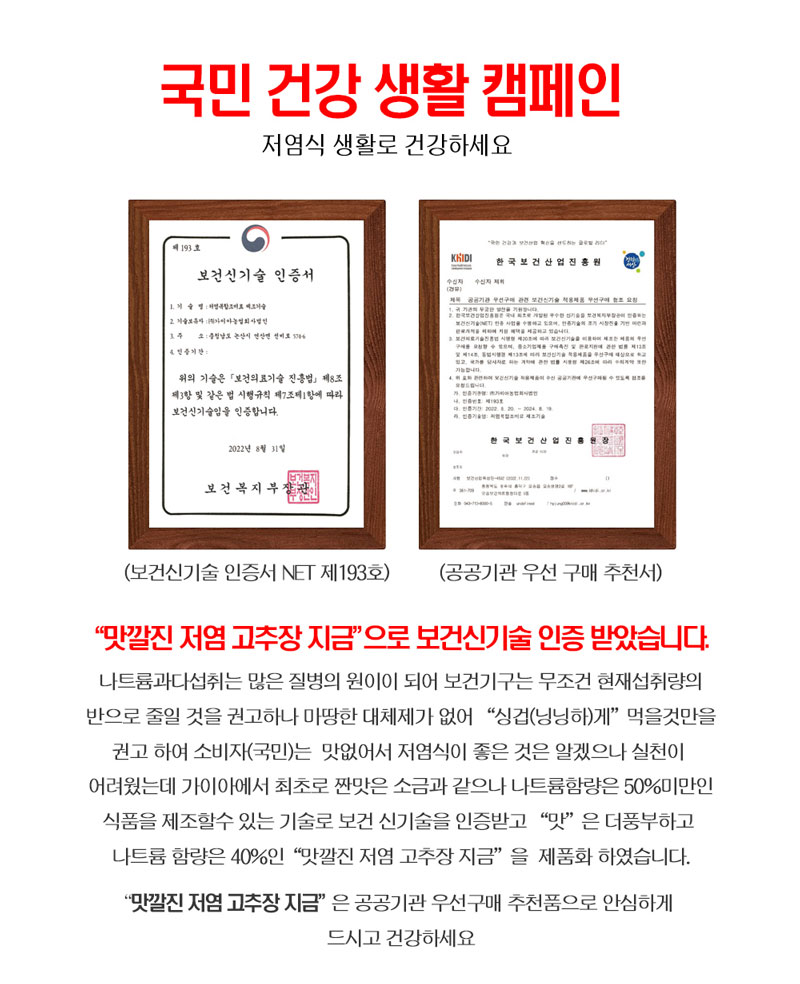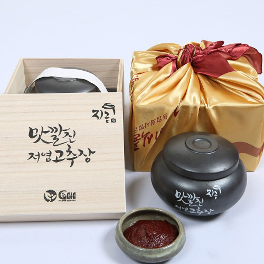 가이아농업회사법인 맛깔진 저염 고추장은 맛있는 고추장의 맛은 그대로 유지하면서 나트륨이 일반 고추장에 비해서 낮기 때문에 더욱 건강한 요리를 드실 수 있습니다. 저염으로 건강한 식단을 만들어보세요.