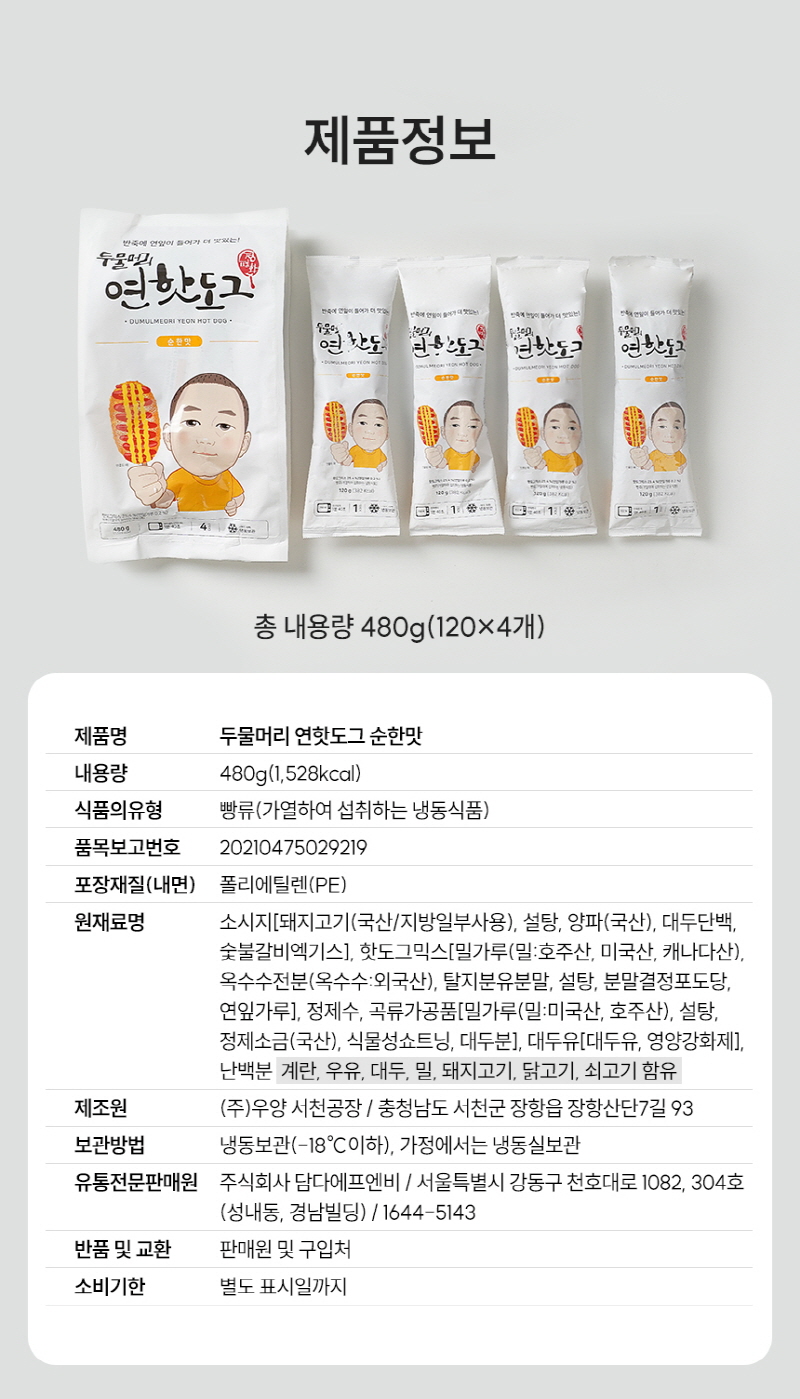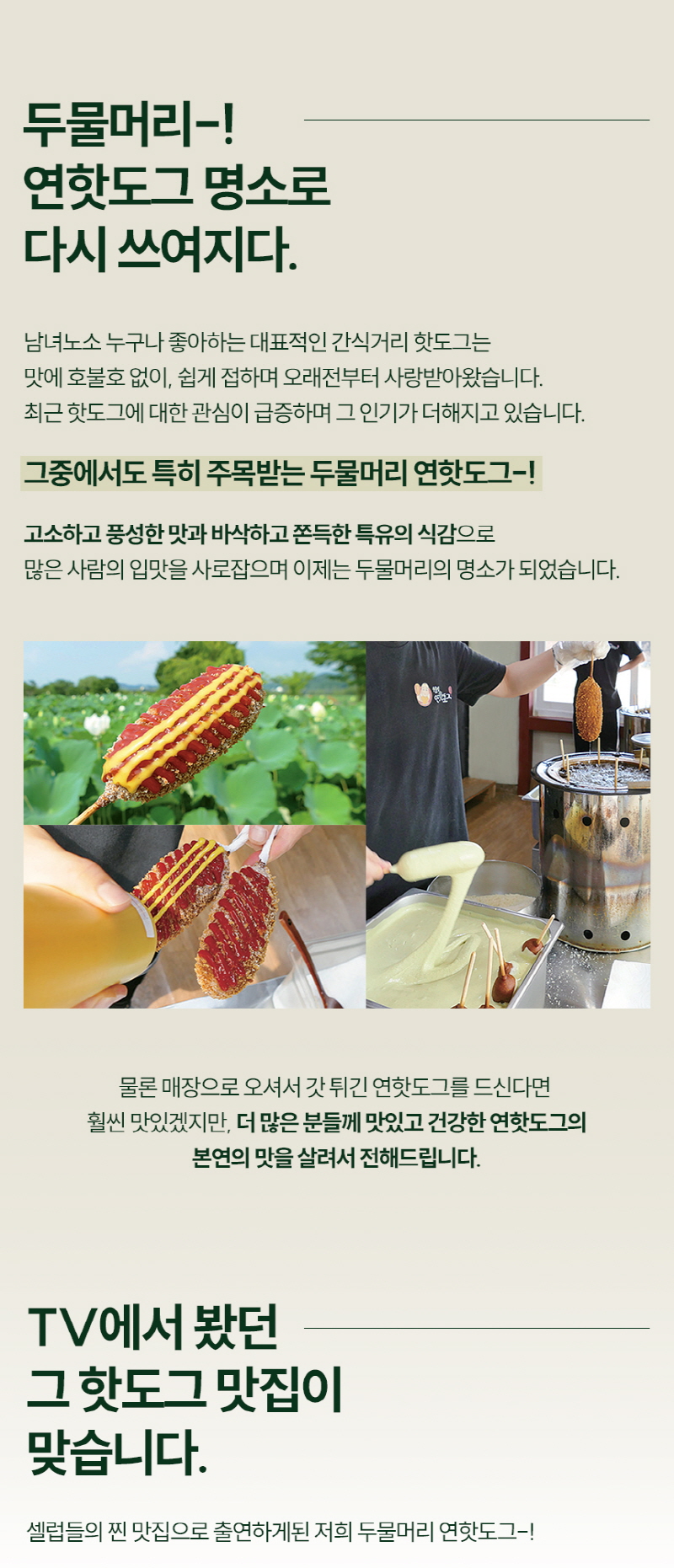 두물머리에 놀러가실때 꼭 가게 되는 곳이 있죠~ 바로 핫도그 매장입니다. 두물머리 필수코스라고 해도 과언이 아니기 때문에 여전히 인기가 좋은데 가끔 두물머리에서 먹었던 핫도그가 생각날대 집에서 편하게 드실 수 있는 두물머리 연핫도그 제품을 만나보세요. 집에서 편하게 맛있는 핫도그를 드실 수 있습니다.