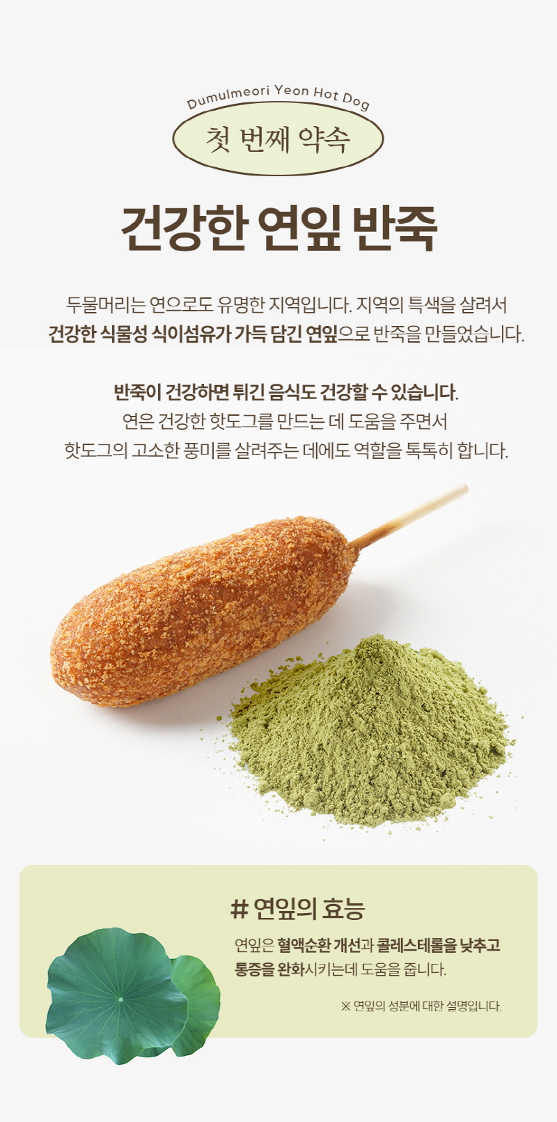 집에서 간편하게 두물머리 연핫도그를 맛있게 드실 수 있는 두물머리 연잎핫도그!! 전자렌지에 간편하게 돌려서 드실 수 있기 때문에 매력적인 핫도그입니다. 맛도 좋고 영양도 챙길 수 있는 핫도그죠~