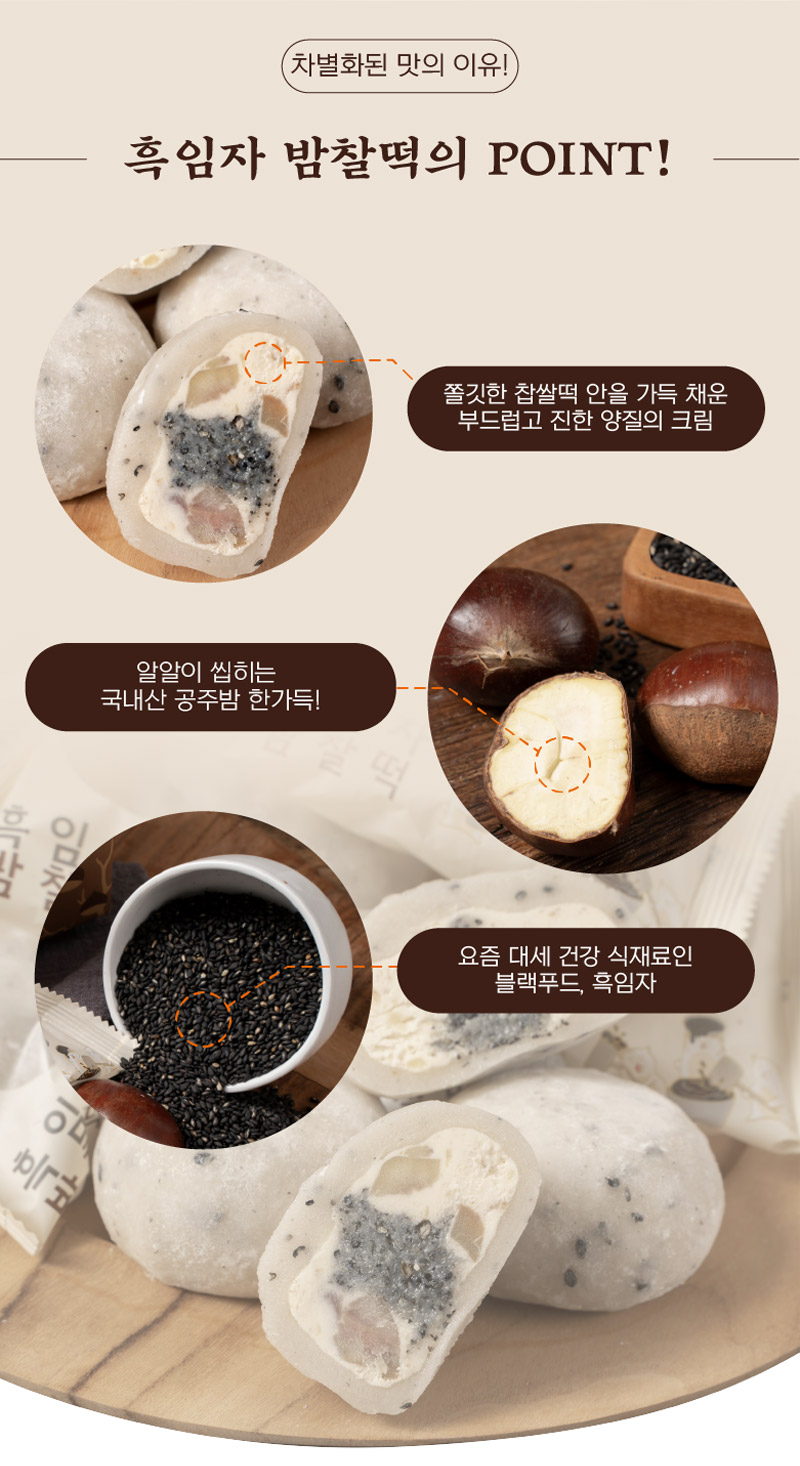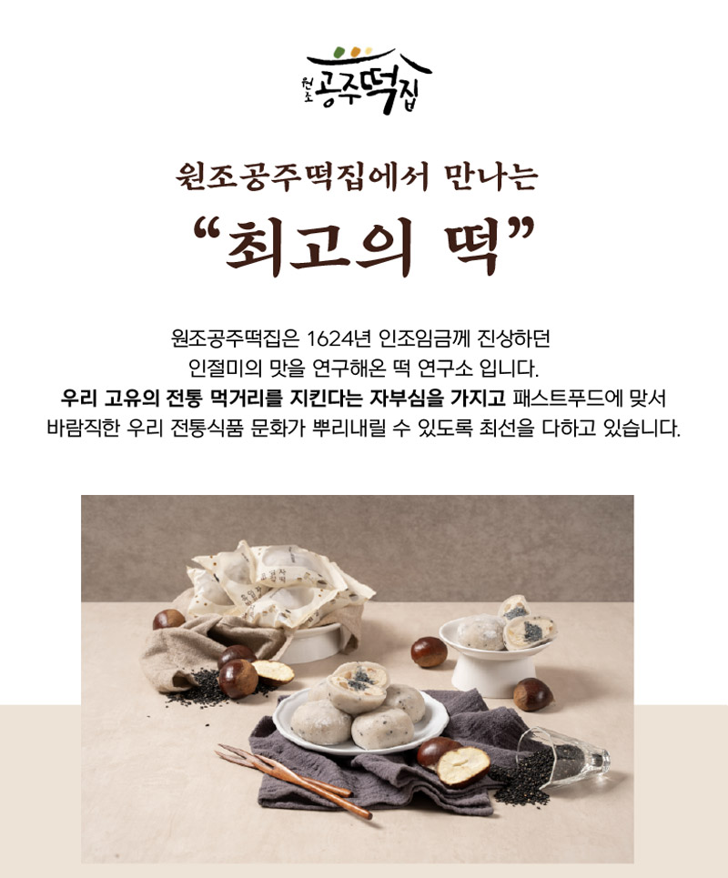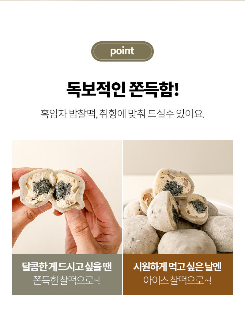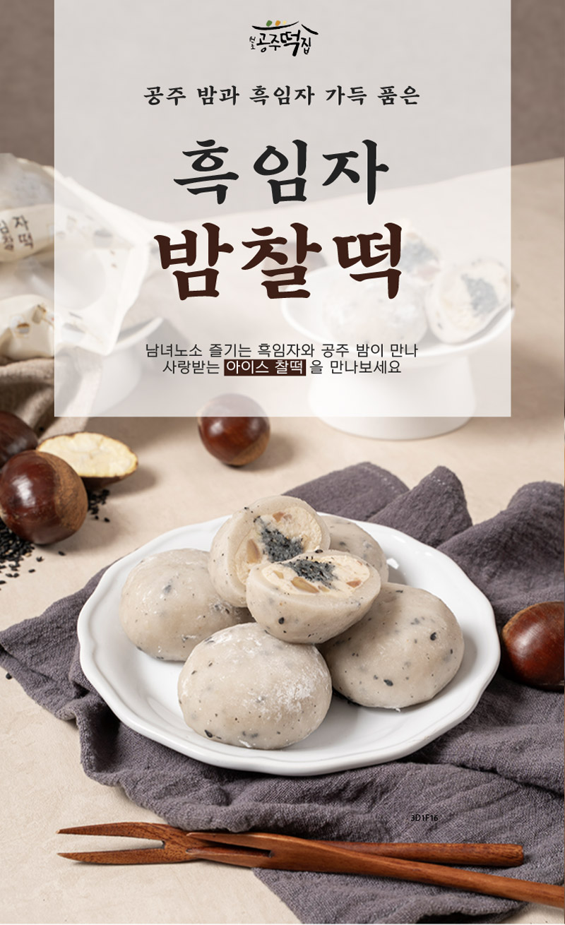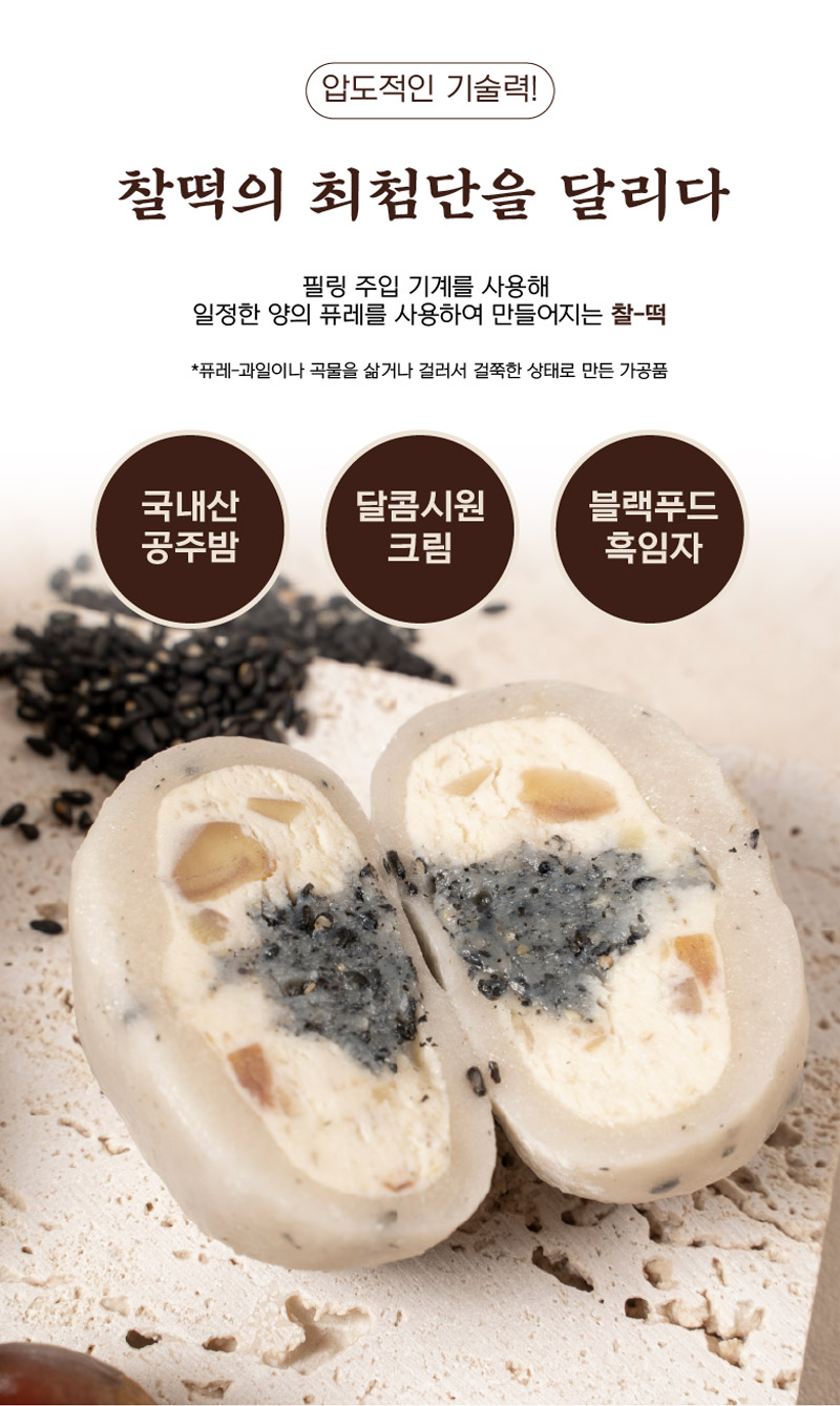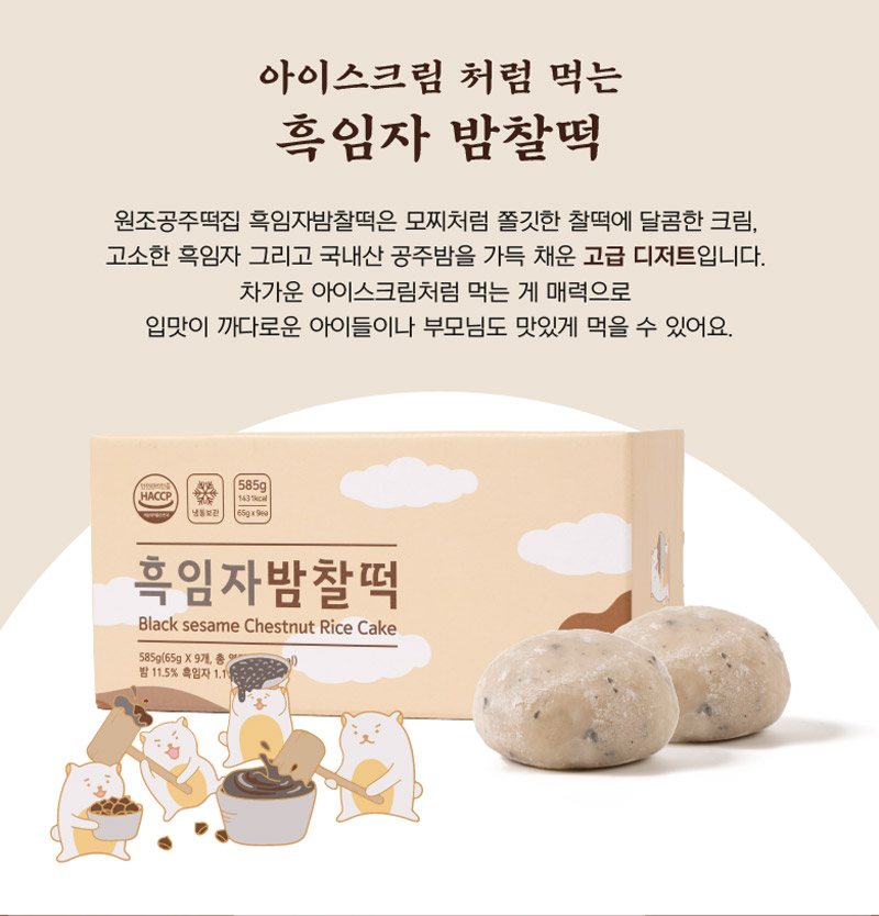 평소에 냉동고에 넣어두고 드시고 싶을때 자연해동해서 드시면 맛있게 드실 수 있는 떡으로 고물도 풍부하고 흑임자와 공주밤이 함께 들어가 있어서 색다른 맛이 느껴지는 떡입니다.