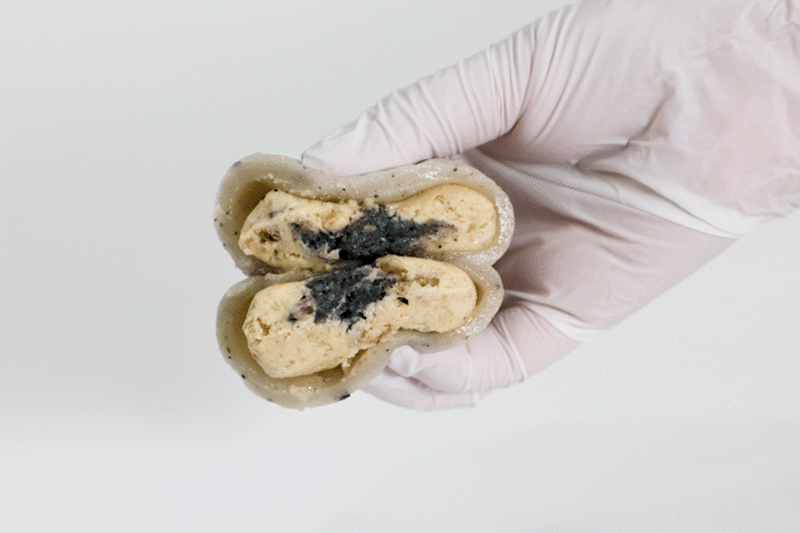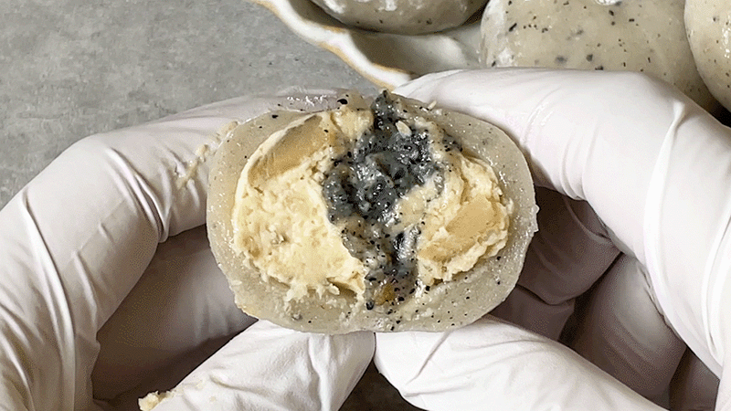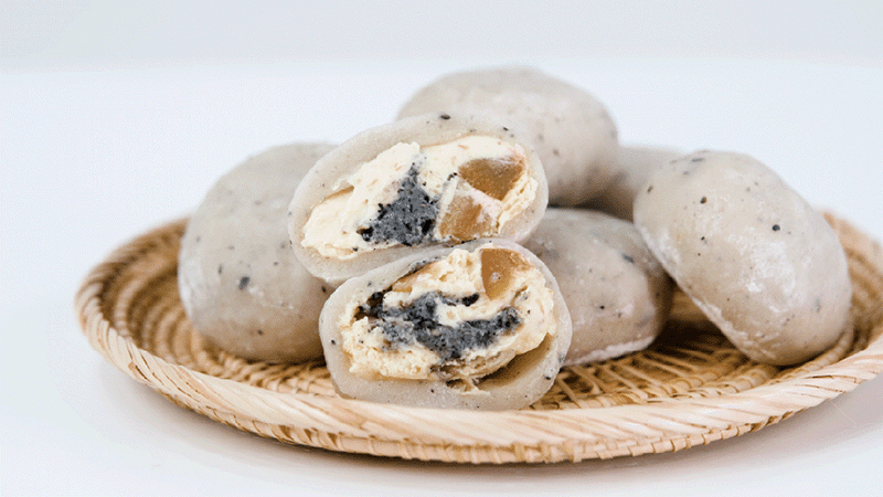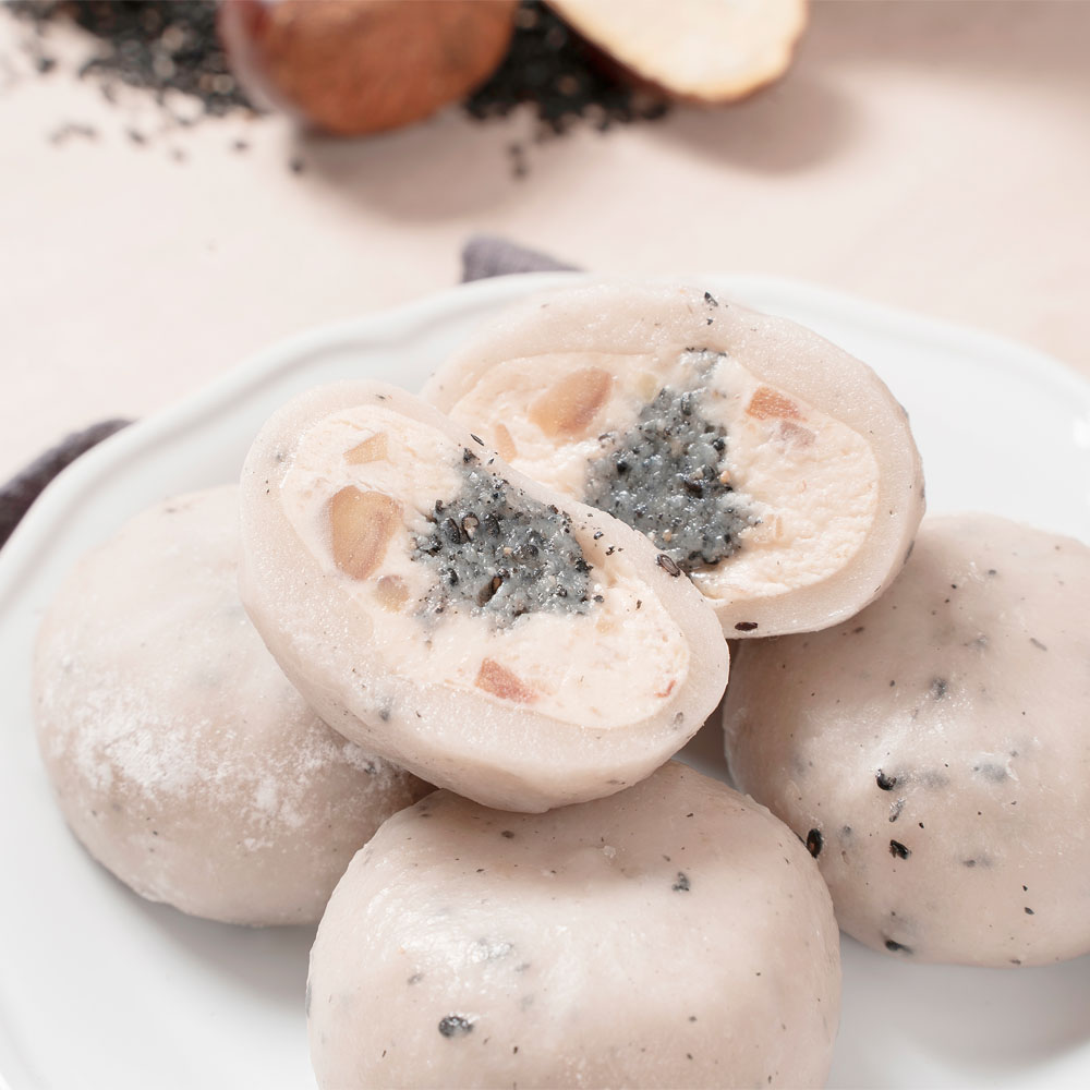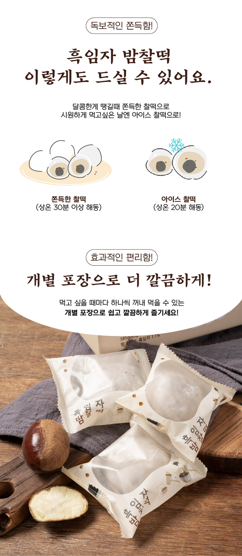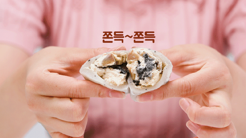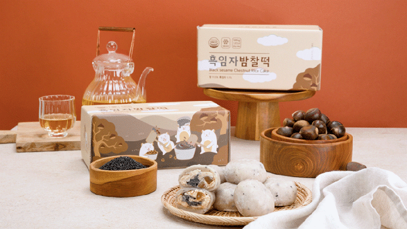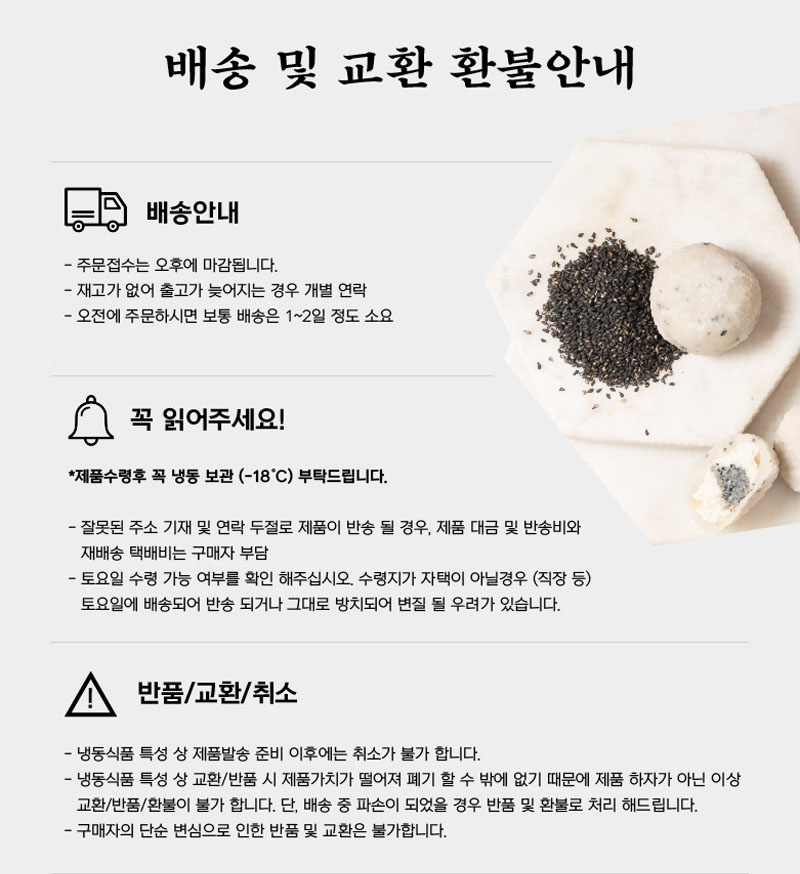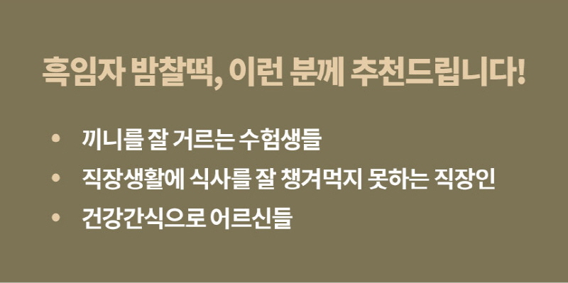 평소에 냉동고에 넣어두고 드시고 싶을때 자연해동해서 드시면 맛있게 드실 수 있는 떡으로 고물도 풍부하고 흑임자와 공주밤이 함께 들어가 있어서 색다른 맛이 느껴지는 떡입니다.